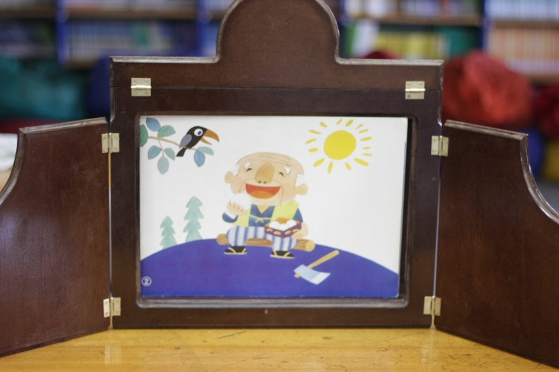 Kamishibai (紙芝居), literalmente «teatro de papel», se dice que comenzó en Japón en 1920. Inicialmente los sacerdotes utilizaban rollos ilustrados junto con narración para transmitir la doctrina budista al público laico. Más tarde, etoki (relator de cuentos) adoptó estos métodos para contar historias más populares. Como el texto está en la parte posterior de las láminas el kamishibai siempre necesita un presentador o intérprete que lea el texto mientras los espectadores contemplan los dibujos. La lectura del kamishibai se realiza colocando las láminas en orden sobre un soporte, teatrillo de tres puertas que se llama ”butai”, de cara al auditorio, y deslizando las láminas una tras otra mientras se lee el texto.